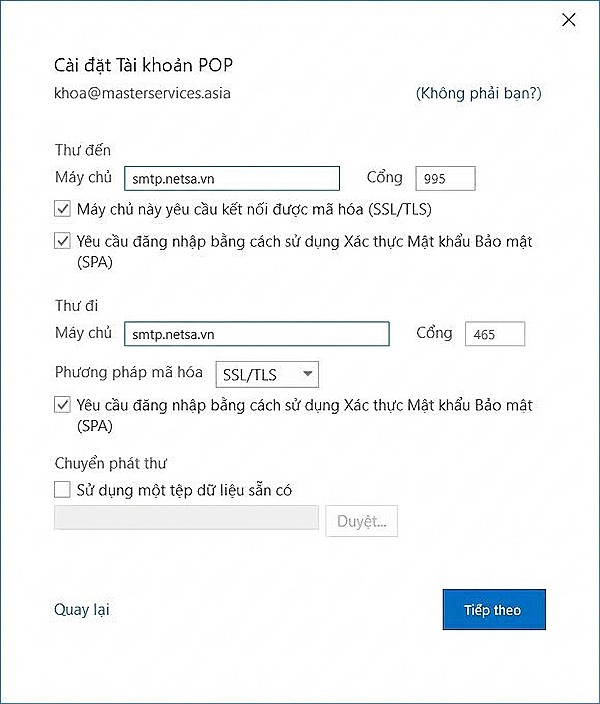 Bước 3: Điền các thông số như hình bên dưới ( nếu là IMAP thì phần thư đến bạn điền cổng là 993 nhé )